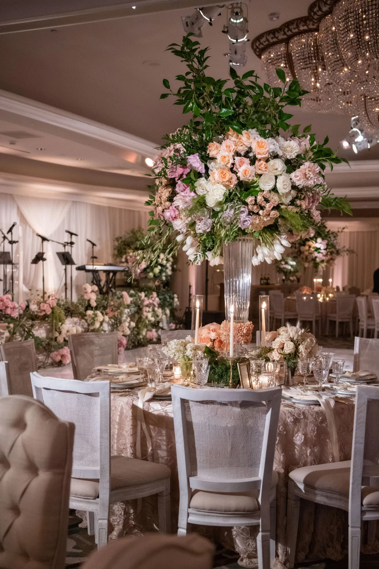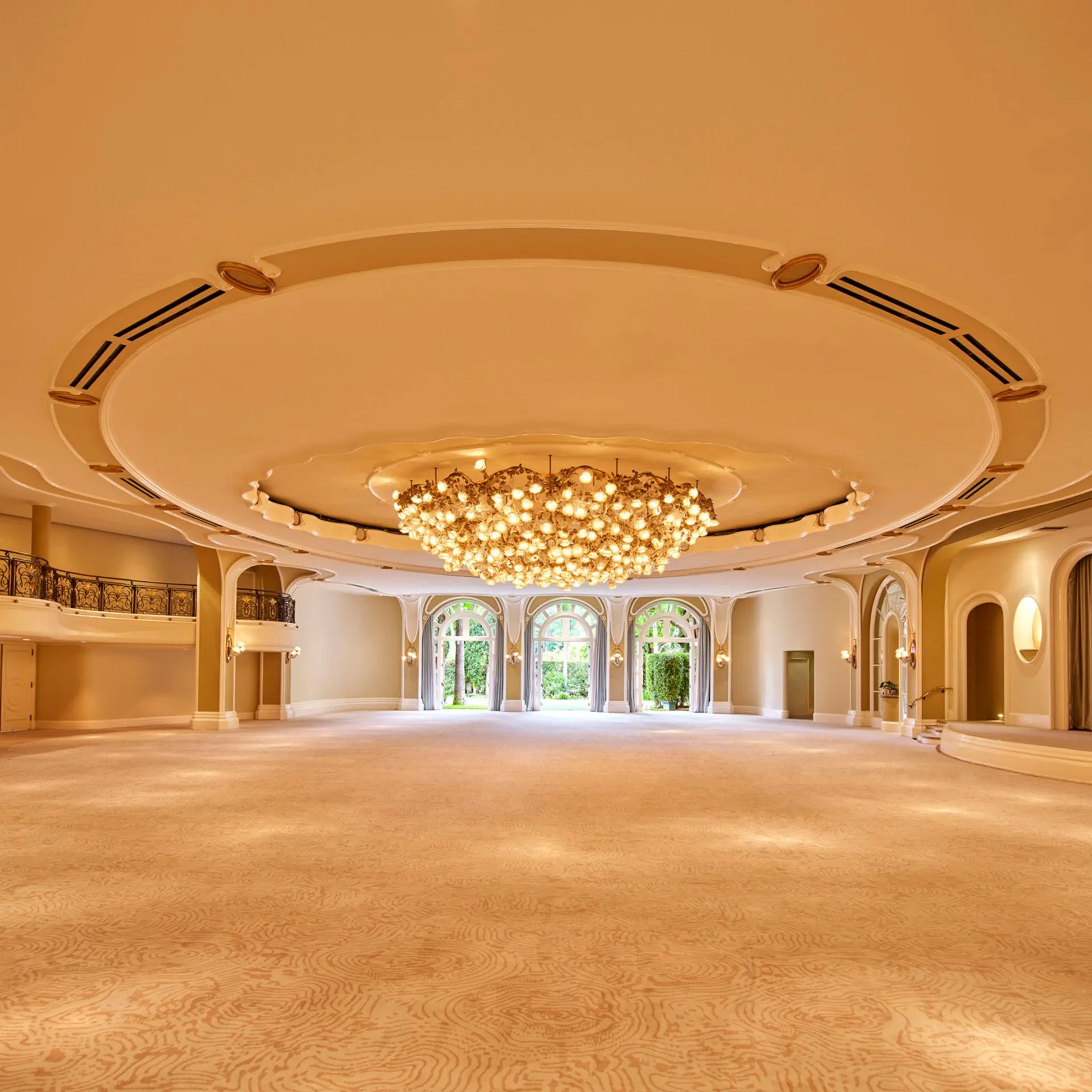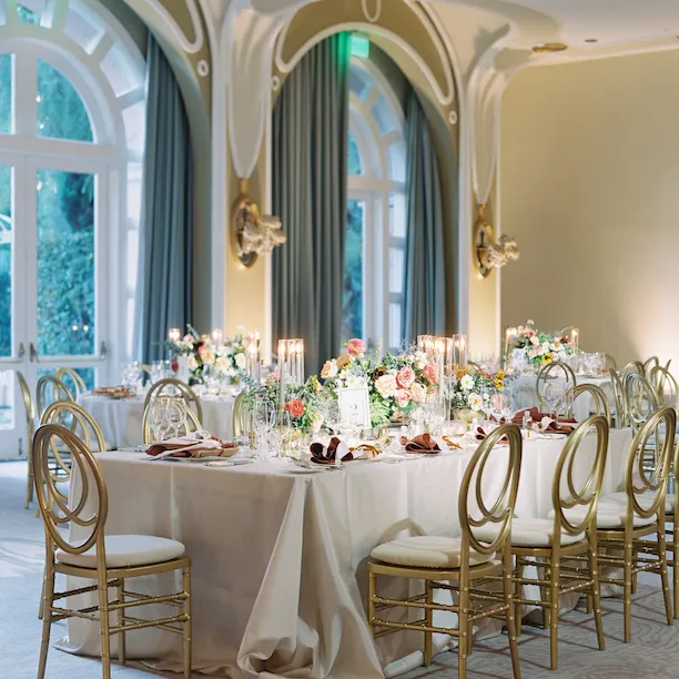 The largest of our ballrooms, starring a built-in stage and dancefloor. A glamorous Art Deco space with spectacular rose chandeliers and French doors overlooking the Crystal Garden and gazebo.