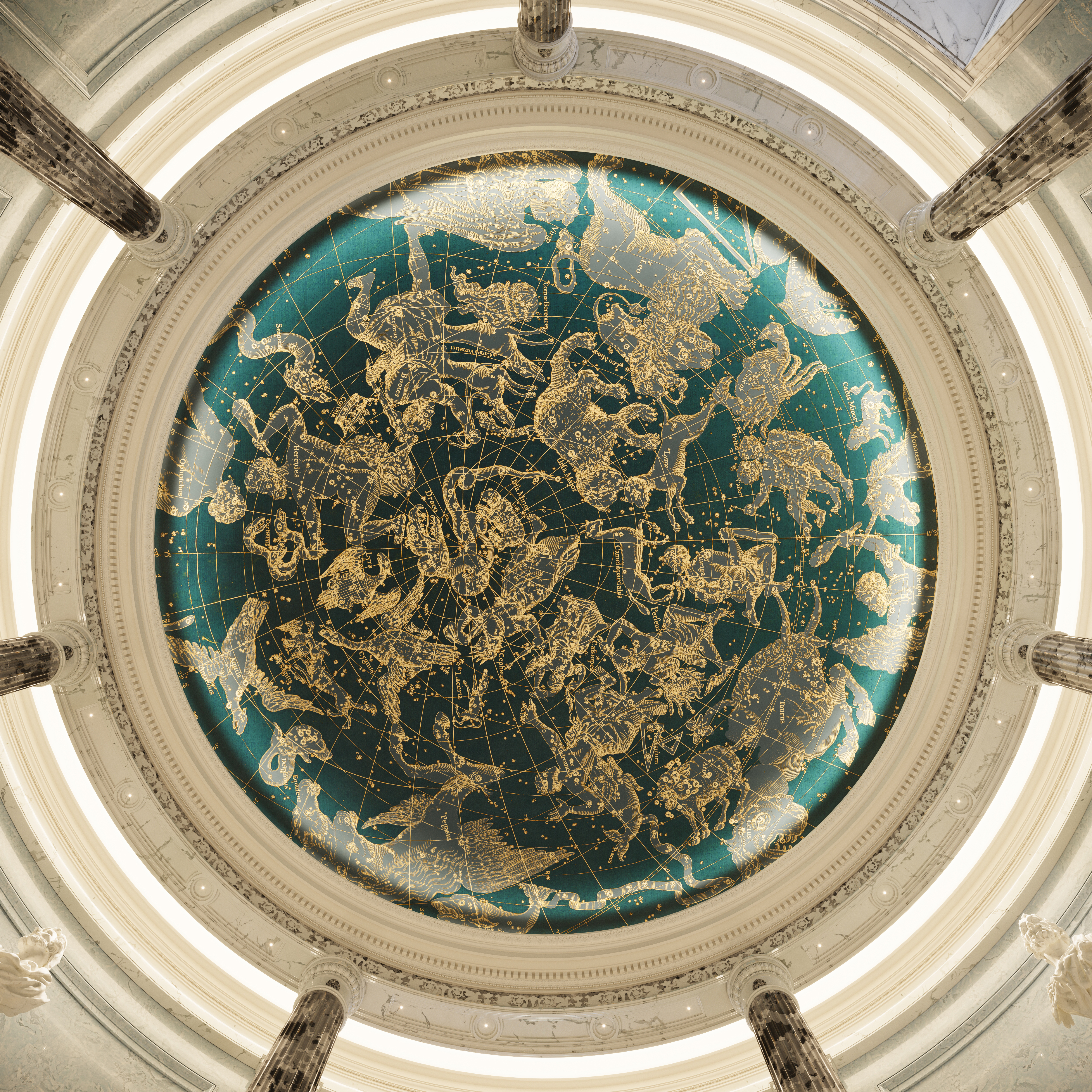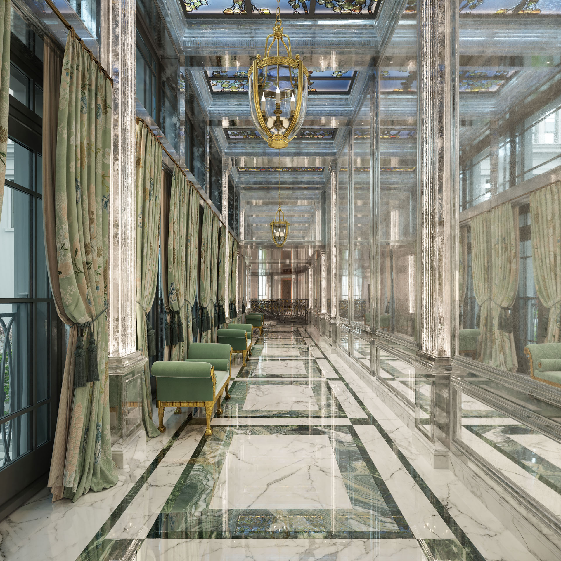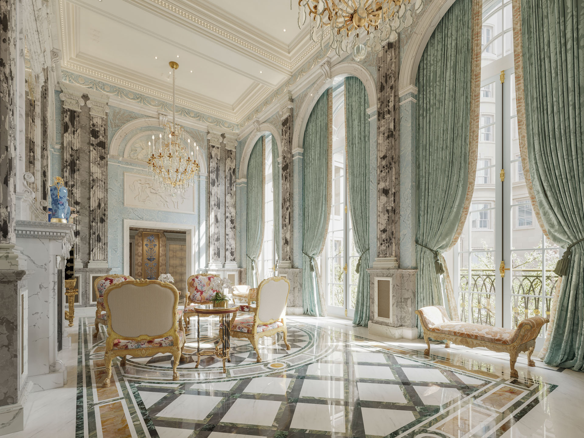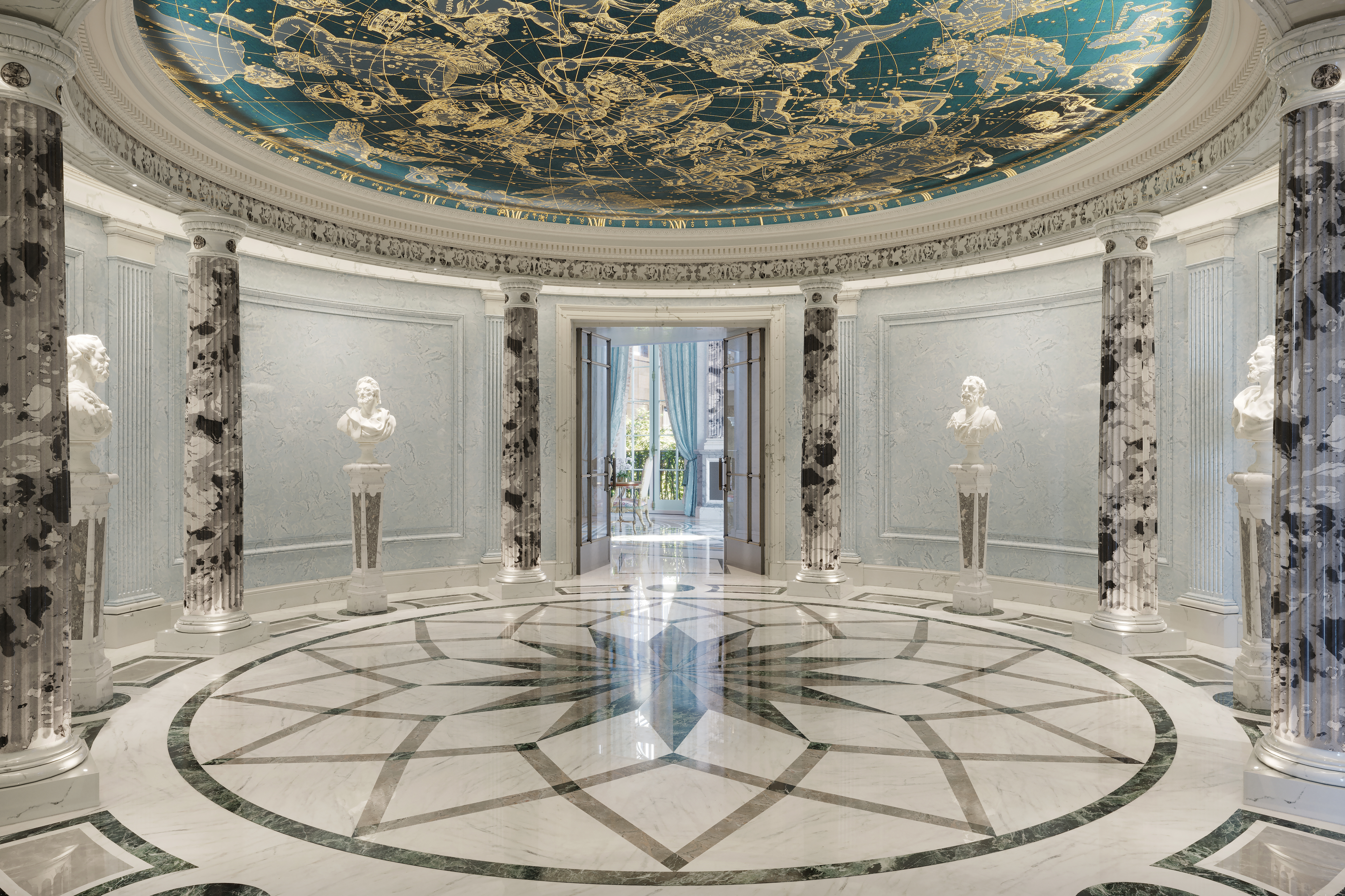 Crafted by internationally acclaimed J.P. Molyneux Studio, the interiors draw inspiration from historic English homes. Spacious foyers and galleries lead to elegant living spaces, where each detail is rich in craft and provenance. From the Crystal Gallery with its hand-set cast glass pieces to the hand-painted frescoes on the ground floor rotunda, Georgian elements combine with modern luxury.